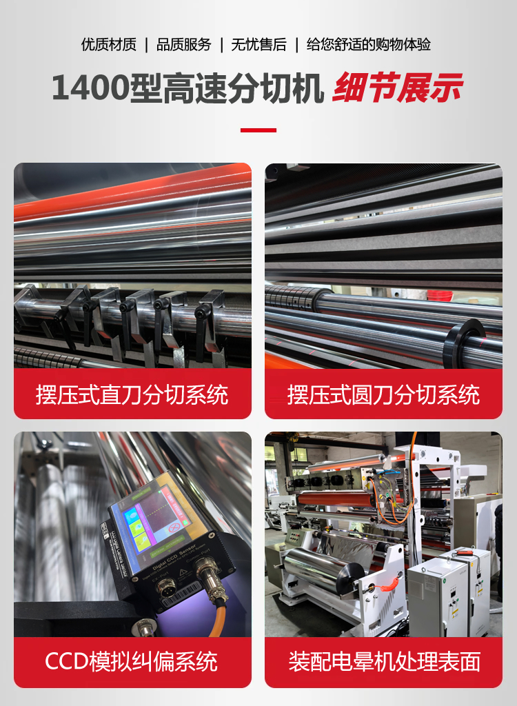 1400D4-2型電腦控制高速分切機,寬幅1400mm,分切速度350m/min,采用CCD模擬糾偏系統(tǒng),分切12u-50um卷筒類鐳射膜、鍍鋁膜、冷燙膜、電化品等塑料薄膜,配備擺壓式直刀和圓刀分切系統(tǒng),分切多種規(guī)格,具有自動化程度高,生產效率高,產品精度高,無劃傷等優(yōu)點。是一臺國內高水平的分切專用設備。